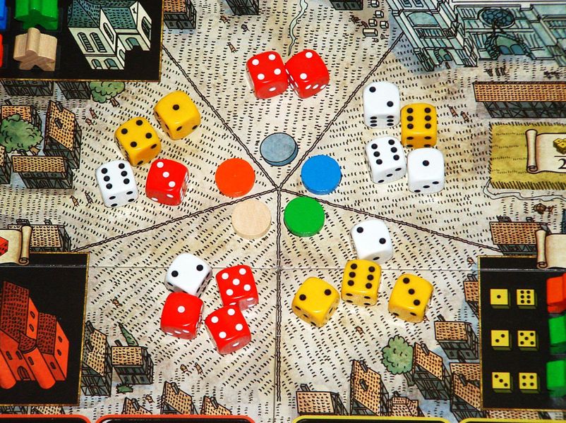 Кубики – це головна умова двигуна ігрового процесу, оскільки вся механіка гри побудована на їх комбінаціях. Кубики на центральній площі – це плата за можливість виконання дій у місті. Будуть доступні як свої кубики, так і кубики суперників, за які треба буде розплатитися монетами.